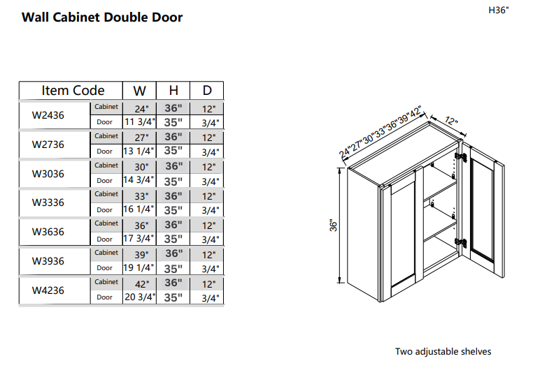 Wall Cabinet - 36"W 36"H 12"D 2D, 2S