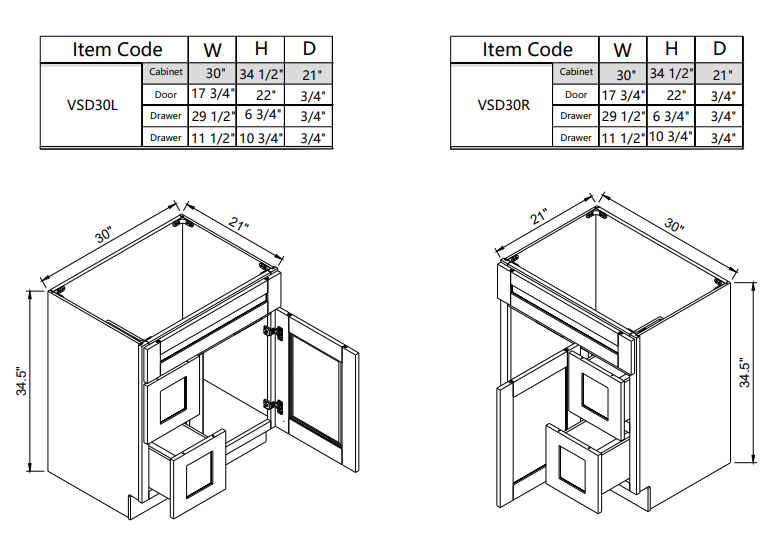 Vanity Sink Base - 30"W x 34 1/2" 21"D 1D, 3 R-Drw
