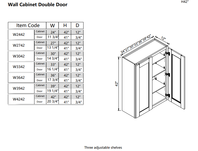 Wall Cabinet - 30"W 42"H 12"D 2D, 3S