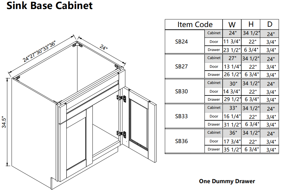 Sink Base Cabinet - 27"W 34 1/2"H 24"D 2D, 1F-Drw